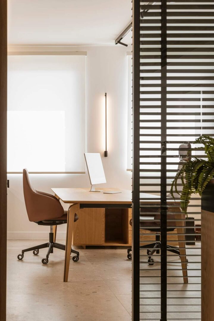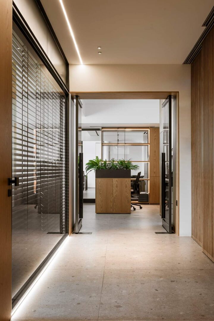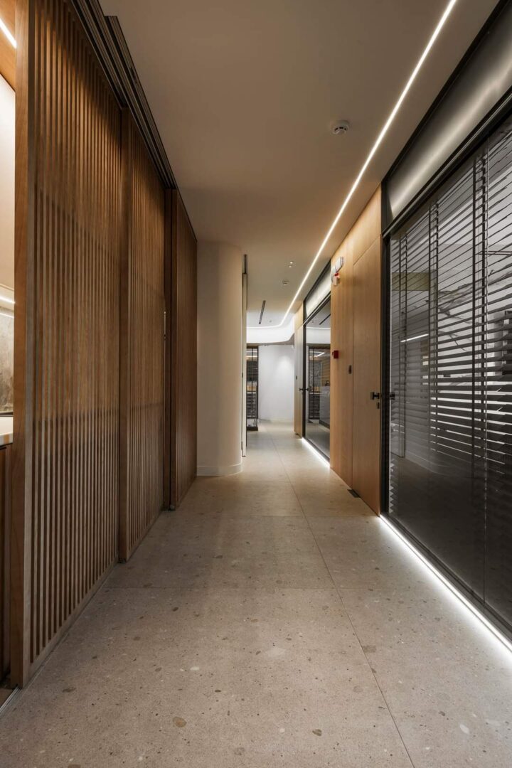 Ο φωτισμός αναδεικνύει την υλικότητα στοιχείων όπως το ξύλο και το μάρμαρο, ενώ παράλληλα καθοδηγεί την κίνηση στον χώρο, δημιουργώντας μια αίσθηση συνέχειας και αρμονίας. Το τελικό αποτέλεσμα συνδυάζει τεχνολογία και αισθητική, αποτυπώνοντας τον σύγχρονο χαρακτήρα των γραφείων και την προσήλωση στην ποιότητα.